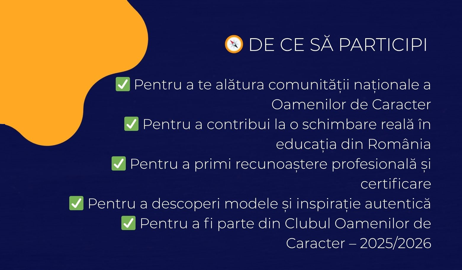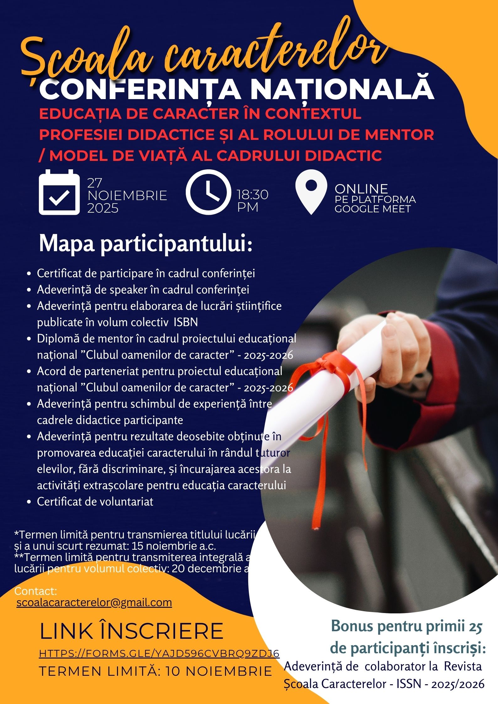 Conferința reprezintă, în același timp, un cadru deschis pentru parteneriate educaționale prin proiectul național „Clubul oamenilor de caracter” – 2025/2026, și o oportunitate unică de publicare într-un volum colectiv ISBN dedicat educației de caracter.